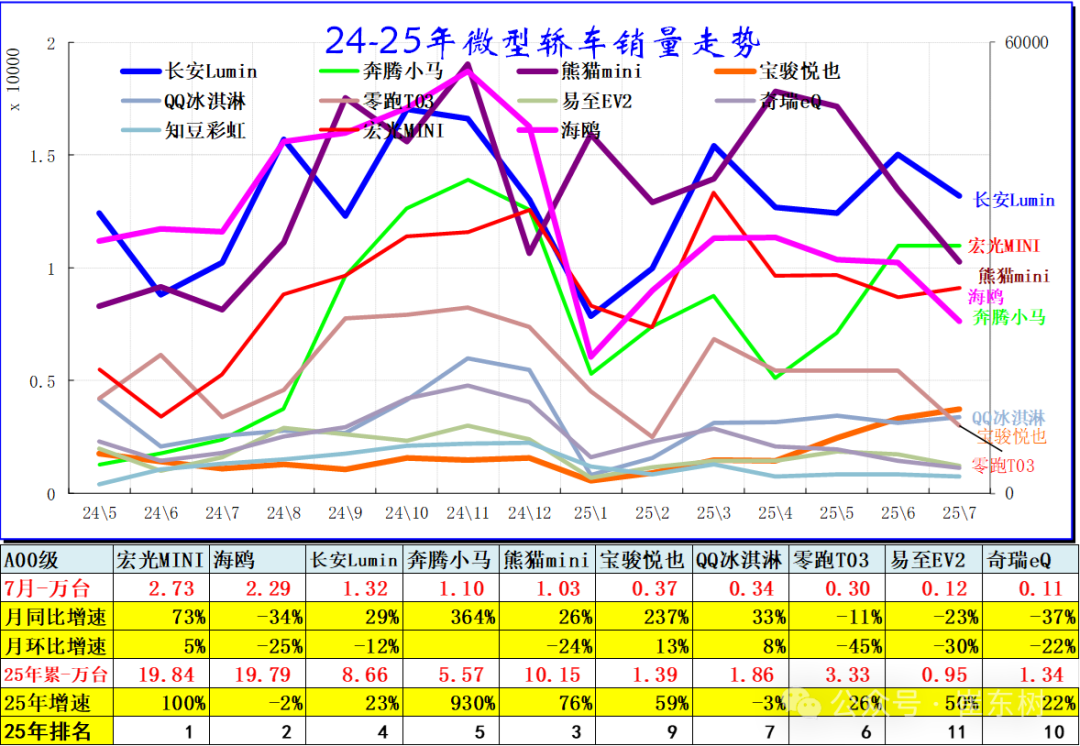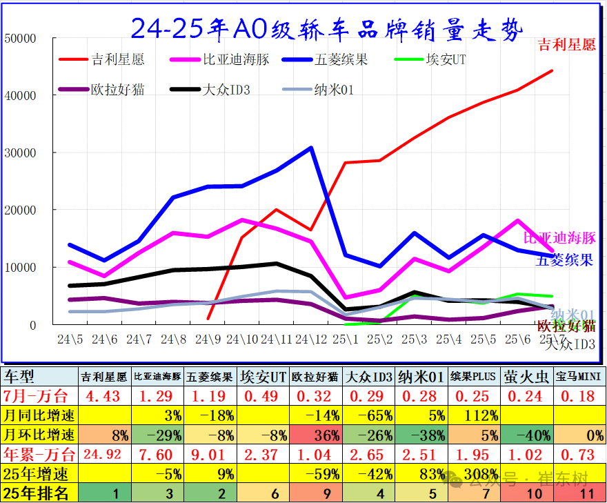 A0级轿车的全面电动化趋势明显,基本没有太强的燃油车产品,体现了自主的纯电动的产品优势明显。