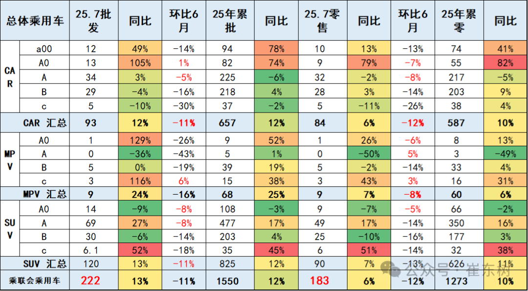 智通财经APP获悉,8月18日,崔东树发布2025年7月乘用车细分市场车型走势。7月全国乘用车厂商批发222万辆创当月历史新高,同比增长13%,环比下降11%;1-7月全国乘用车厂商批发1,550万辆,同比增长12.4%。受零售调整的影响,7月乘用车批发同比增速比零售增速高7个百分点。7月自主车企批发158万辆,同比增长20%,环比下降5%;主流合资车企批发44万辆,同比增长7%,环比下降21%;豪华车批发20万辆,同比下降16%,环比下降25%。