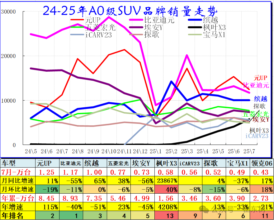 A0级SUV 2025年7月批发14.39万台,占批发份额12%,批发较去年同期同比下降9%,批发环比今年上月下降8%;2025年7月零售较去年同期同比下降7%,零售环比今年上月下降5%。2025年1-7月批发数量108.15万台,厂家批发销售累计下降3%;2025年1-7月国内零售数量65.53万台,零售累计下降2%。