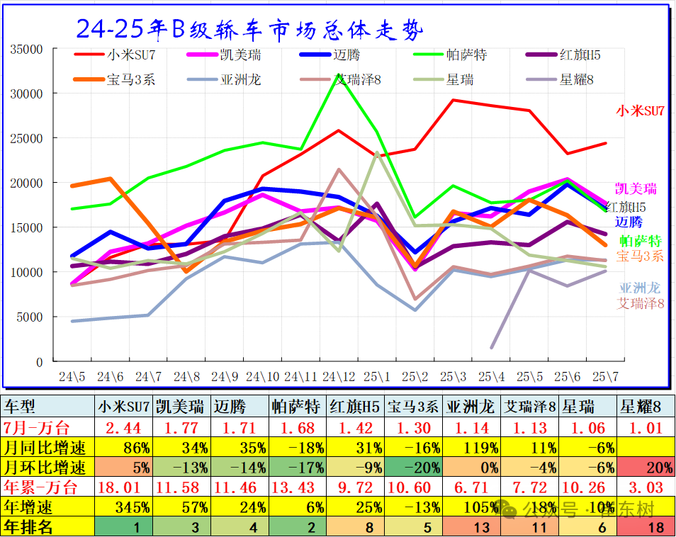 B级轿车2025年7月批发28.73万台,占批发份额30.96%,批发较去年同期同比下降4%,批发环比今年上月下降16%;2025年7月零售较去年同期同比增长3%,零售环比今年上月下降14%。2025年1-7月批发数量218.39万台,厂家批发销售累计增幅4%;2025年1-7月国内零售数量203.31万台,零售累计增幅9%。