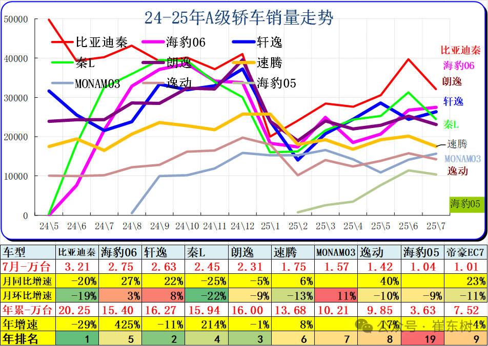 A级轿车2025年7月批发33.58万台,占批发份额36.2%,批发较去年同期同比增长3%,批发环比今年上月下降5%;2025年7月零售较去年同期同比下降2%,零售环比今年上月下降8%。2025年1-7月批发数量225.17万台,厂家批发销售累计下降6%;2025年1-7月国内零售数量216.51万台,零售累计下降5%。