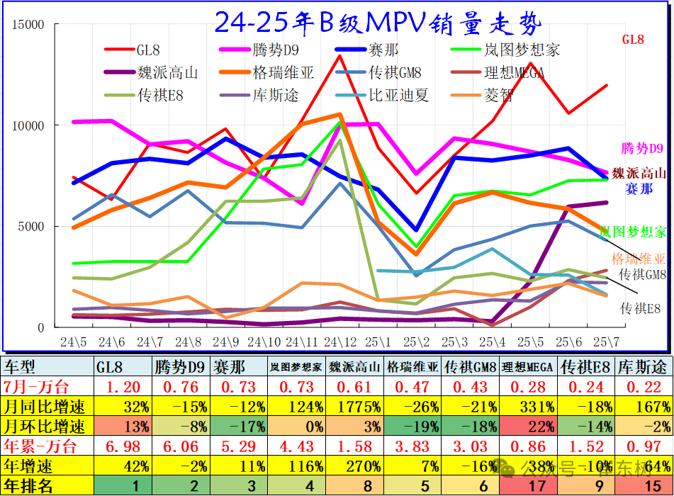 MPV市场的高增长阶段已经改为低增长趋势。GL8近期表现较强,比亚迪与腾势和传祺的MPV表现超强,日系的MPV优势迅速下降。