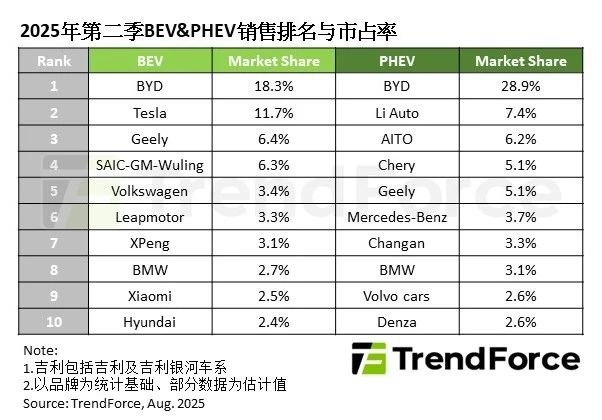 BYD(比亚迪)以18.3%的市占率稳居BEV最大品牌,销量年增率高达43%。Tesla(特斯拉)虽维持市占第二名,但在中国、北美、西欧等市场表现衰退,即便于韩国、挪威和土耳其有所成长,也难以弥补主要市场的下滑幅度,导致第二季整体销量年减约14%。