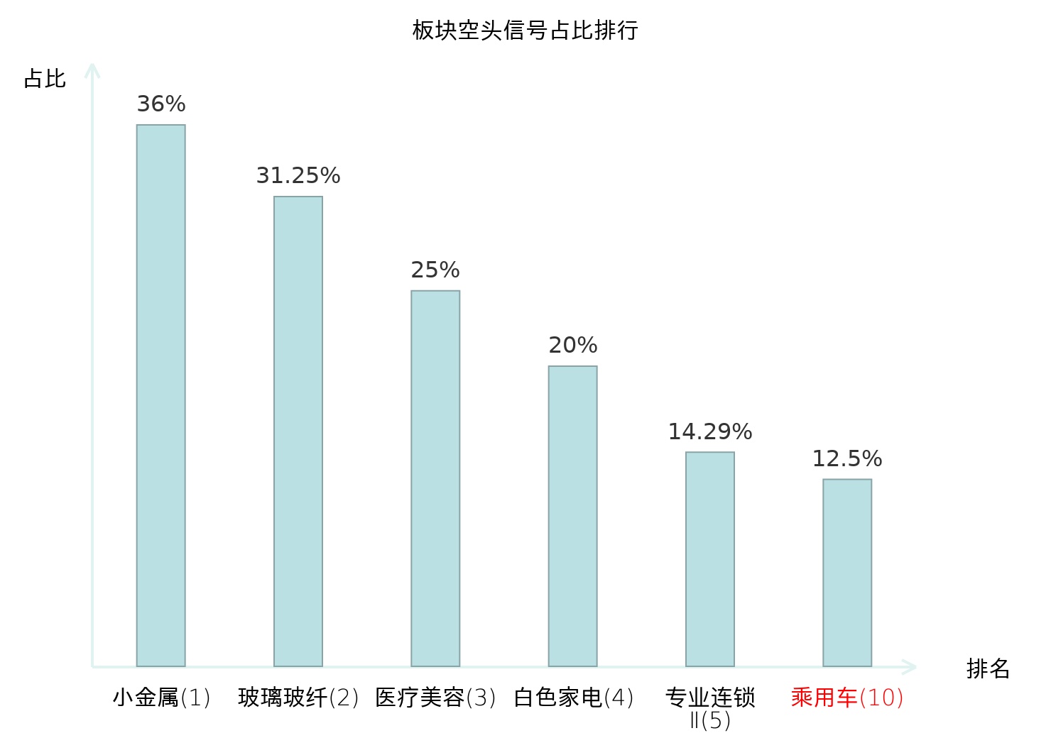 全市场所有行业板块中主力空头信号占比排名中,小金属板块位居第一。光伏设备板块名次提升最快,较昨日上升97位。