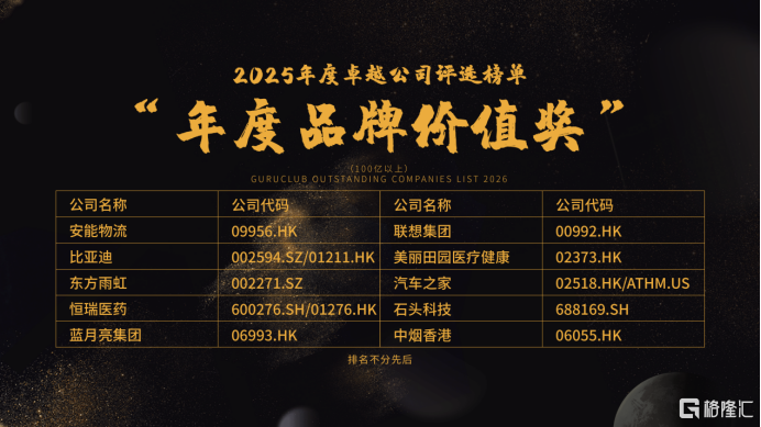 12月22日,格隆汇在线上举办"科技赋能·资本破局"分享会。本次分享会,备受瞩目的卓越公司评选榜单将隆重揭晓,其中格隆汇“金格奖”年度卓越公司评选中,安能物流(09956.HK)、比亚迪(002594.SZ/01211.HK)、东方雨虹(002271.SZ)、恒瑞医药(600276.SH/01276.HK)、蓝月亮集团(06993.HK)、联想集团(00992.HK)、美丽田园医疗健康(02373.HK)、汽车之家(02518.HK/ATHM.US)、石头科技(688169.SH)、中烟香港(06055.HK)10家企业荣获“年度品牌价值奖(大市值)”奖项。(排名不分先后,按公司首部字母顺序排列)
