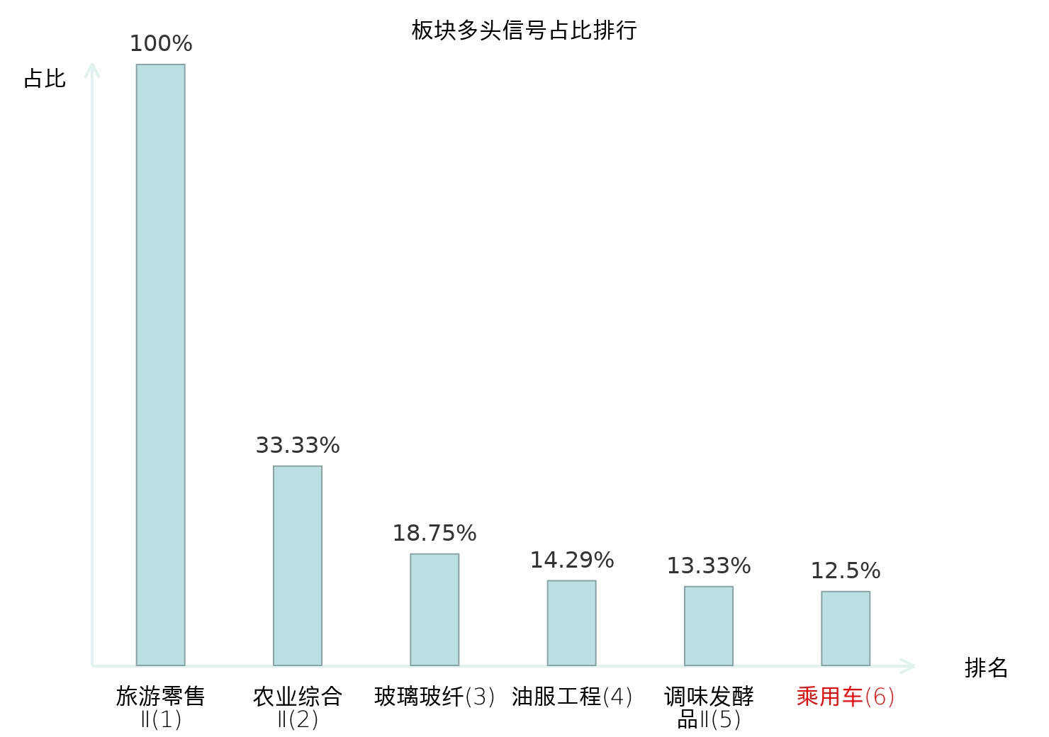 全市场所有行业板块中主力多头信号占比排名中,旅游零售Ⅱ板块位居第一。旅游零售Ⅱ板块名次提升最快,较昨日上升130位。