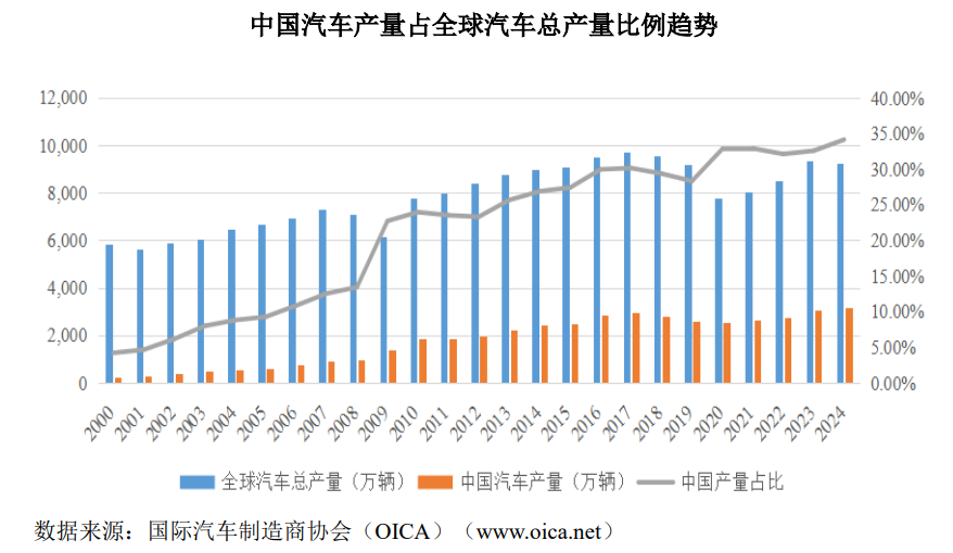 根据国际汽车制造商协会(OICA)的统计数据,中国市场的份额尤为突出,已成为全球汽车产量最高的国家,2024年度中国汽车产量占全球汽车总产量已达34.11%,占比超三分之一。