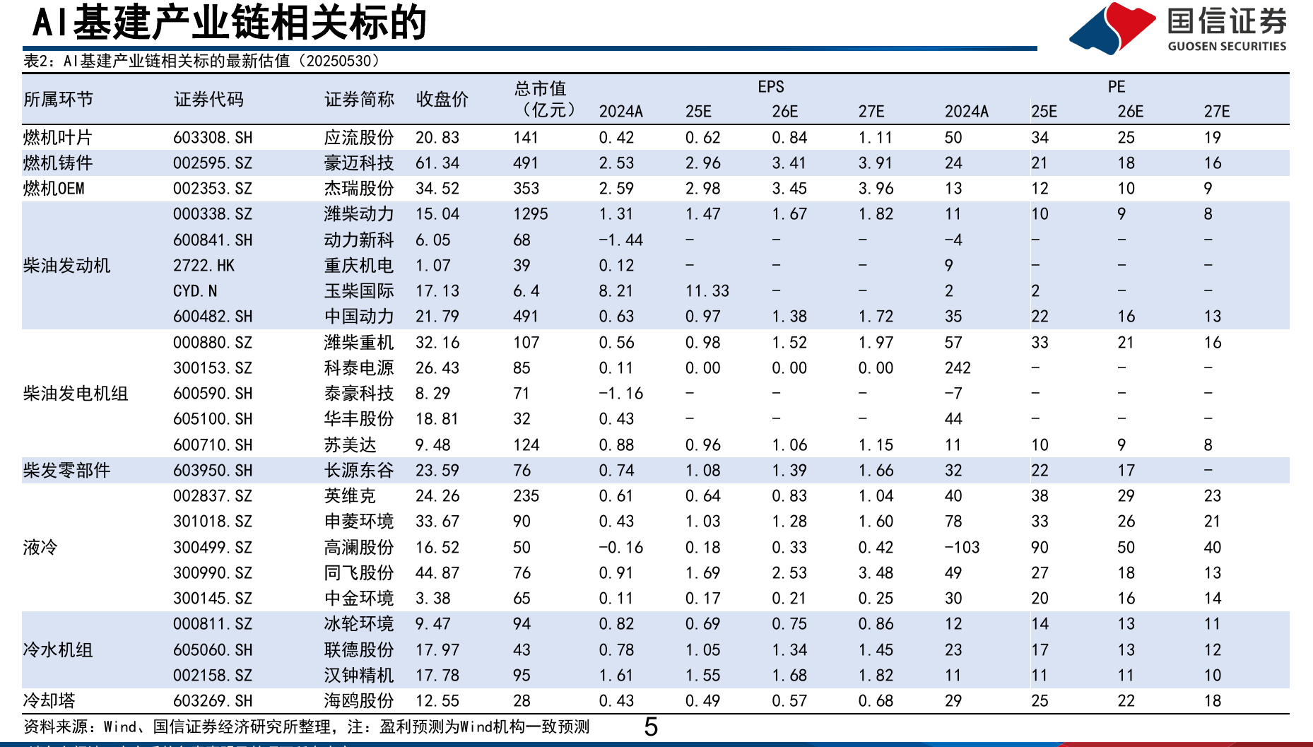 AI基建产业链上游可分为基建基础设施(包括基础施工、制冷系统、供配电系统、建筑装修)和IT基础架构(AI芯片、AI服务器、网络设备、存储设备)。国信证券认为,从海内外大厂CAPEX支出情况看,AIDC基建投资成为资本开支核心方向,AI基建景气上行周期确立。AI基建资本开支处于爆发拐点,产业长景气周期确定,供配电系统和制冷系统作为价值量高、技术关键环节将深度受益。建议重点关注各产业链核心卡位、供给刚性、绑定大客户放量的环节:1)主用电源燃机产业链关注热端叶片和其他铸件:重点推荐【应流股份】、【豪迈科技】;2)制冷环节重点关注液冷、冷水机组及冷水机组压缩机核心配套厂商:重点推荐【冰轮环境】、【汉钟精机】、【联德股份】、【同飞股份】。