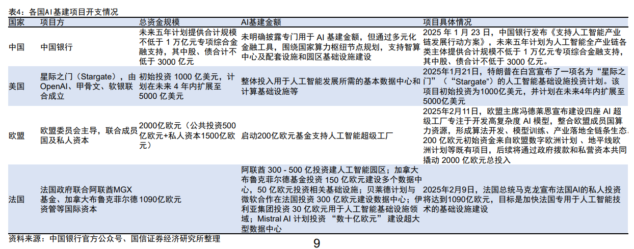 Marvell在AIDay上宣称,北美CSP厂商2025年投入预计为5950亿美元,2028年有望达10220亿美元,CAGR为20%。国信证券研报指出,2025年初以来,中美欧等国家地区纷纷发布千亿美元以上资金规模投向AI基建领域:中国银行万亿元专项金融支持、美国1000亿美元(未来4年内扩展至5000亿美元)、欧盟2000亿欧元、法国1090亿欧元。