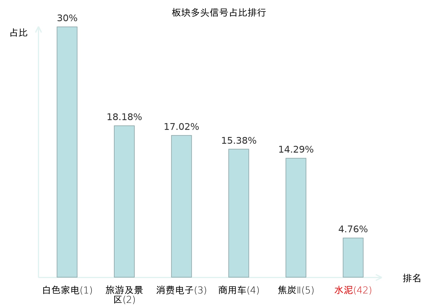 全市场所有行业板块中主力多头信号占比排名中,白色家电板块位居第一。焦炭Ⅱ板块名次提升最快,较昨日上升117位。