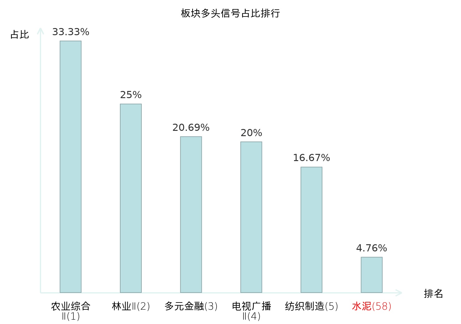 全市场所有行业板块中主力多头信号占比排名中,农业综合Ⅱ板块位居第一。农业综合Ⅱ板块名次提升最快,较昨日上升127位。