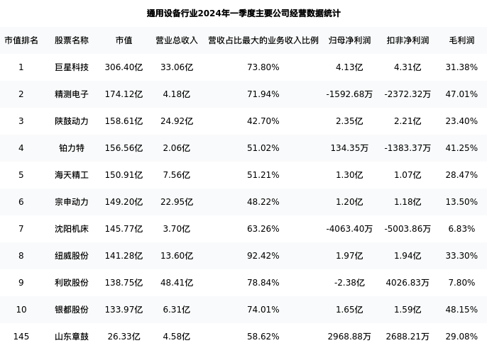 山东章鼓最新报告期数据为一季度,下表汇总了通用设备行业内市值靠前的公司一季度主要经营数据