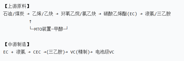 VC (碳酸亚乙烯酯):分子式 C₃H₂O₃,分子量 86.05,无色透明液体,锂电池电解液核心添加剂。VC的生产原料主要包括碳酸乙烯酯(EC)、氯代碳酸乙烯酯、碳酸二甲酯(DMC)及三乙胺,其中EC是核心原材料(1吨VC需3吨EC)。EC的供应:国内EC产能充足(2023年产能约100万吨),主要生产企业包括石大胜华、山东章鼓等,且EC的原料(环氧乙烷、二氧化碳)国内自给率100%,其他原料:氯代碳酸乙烯酯、DMC等均为锂电池产业链的中间产品,供应稳定。VC的下游需求高度集中于锂电池电解液,占比超过90%。电解液的下游则是新能源汽车、储能设备及消费电子: