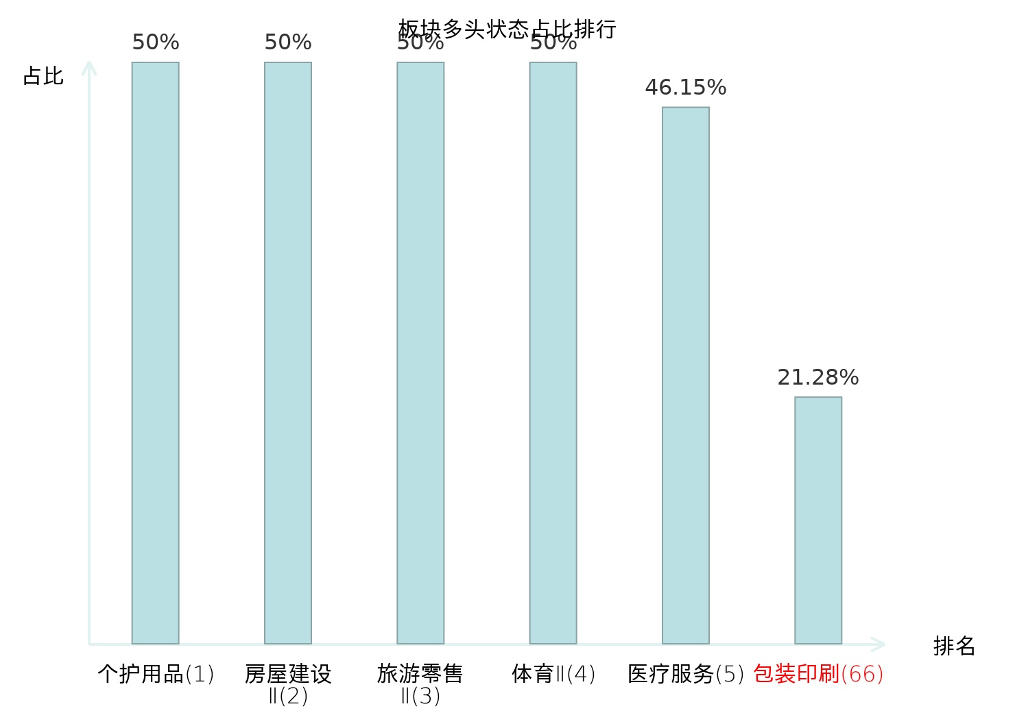 全市场所有行业板块中主力多头状态占比排名中,个护用品板块位居第一。影视院线板块名次提升最快,较昨日上升56位。