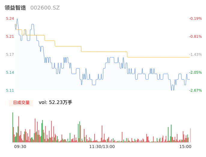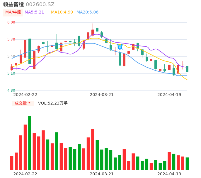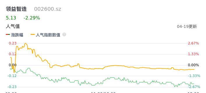 04月19日,领益智造收报5.13,股价涨幅-2.29%,成交金额2.70亿元,换手率0.76%。