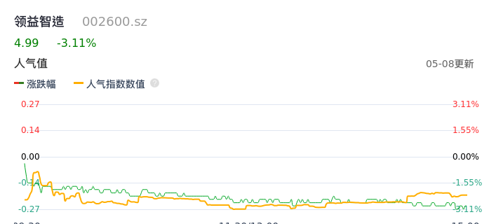 05月08日,领益智造收报4.99,股价涨幅-3.11%,成交金额4.70亿元,换手率1.35%。