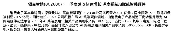 值得注意的是:2024年05月东方证券的蒯剑/韩潇锐/杨宇轩分析师,首次发布关于领益智造的研究报告,标题为:领益智造(002600):一季度营收快速增长 深度受益AI赋能智慧硬件。