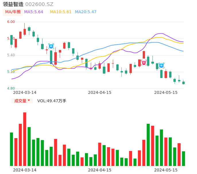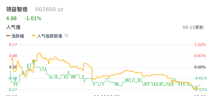 05月15日,领益智造收报4.88,股价涨幅-1.01%,成交金额2.42亿元,换手率0.72%。