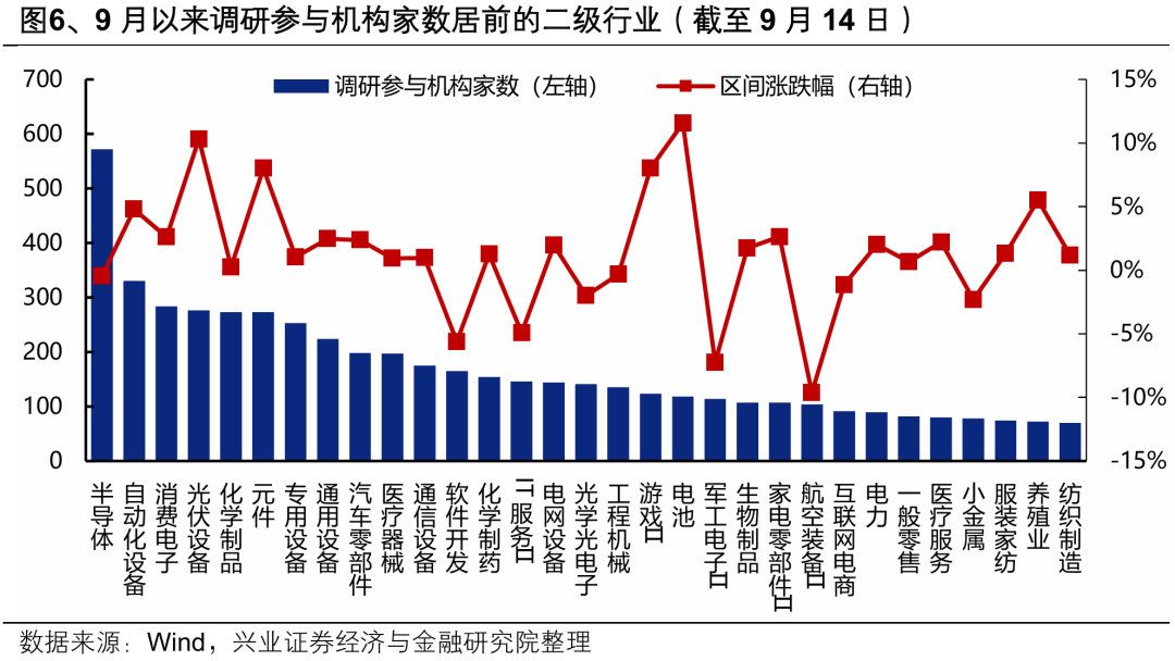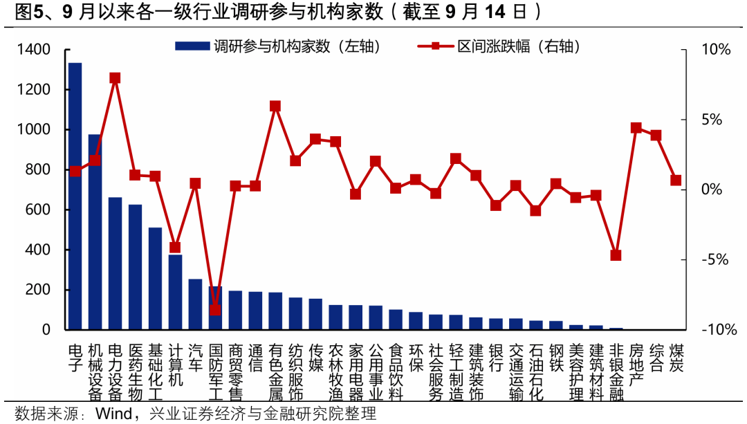 兴业证券发布研报称,随着市场赚钱效应不断扩散,今年以来机构调研热情高涨。该行统计的9月以来各行业及公司的机构调研数据显示,行业层面,9月以来电子、机械、电力设备、医药、化工、计算机、汽车等一级行业调研参与机构家数居前,具体到二级行业主要包括电子(半导体、消费电子、元件等)、机械(自动化设备等)、电力设备(光伏设备、电网设备、电池)、医药(化学制品、医疗器械等)、化工(化学制品)、计算机(软件开发、IT服务)、汽车(汽车零部件),还包括通信设备、游戏、军工(军工电子、航空装备)等其他细分行业。