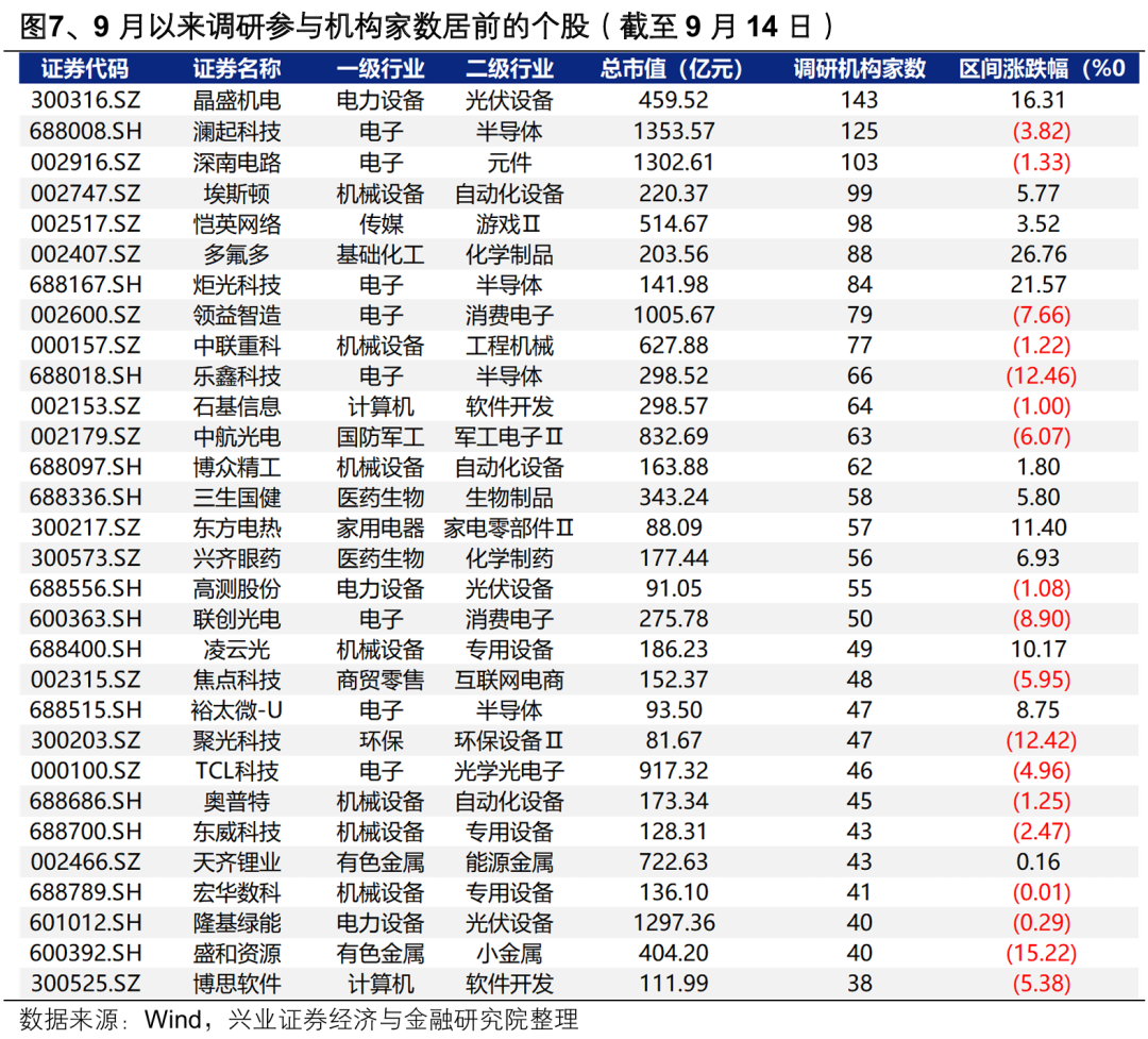 个股层面,9月以来调研参与机构家数居前的个股主要包括:电子如澜起科技(688008.SH)、深南电路(002916.SZ)、炬光科技(688167.SH)、领益制造(002600.SZ)、乐鑫科技(688018.SH)等、电力设备如晶盛机电(300316.SZ)、高测股份(688556.SH)、隆基绿能(601012.SH)、机械设备如埃斯顿(002747.SZ)、中联重科(000157.SZ)、博众精工(688097.SH)、凌云光等(688400.SH)、计算机如石基信息(002153.SZ)、博思软件等、游戏(恺英网络)、化学制品(多氟多)、化学制药(兴齐眼药)等。