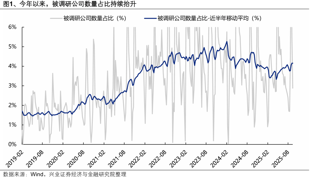 今年以来机构调研公司数量占比持续抬升。随着市场赚钱效应不断扩散,今年以来机构调研热情高涨,被调研公司数量占比也持续抬升。