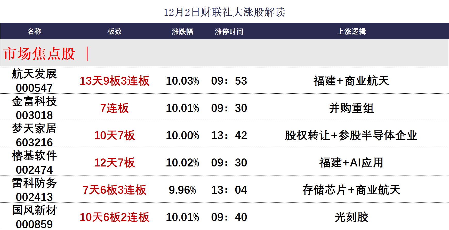 据中国航天科技集团一院消息,我国首个火箭网系回收海上平台“领航者”于11月30日成功交付。商业航天概念结束昨日分歧今日再度展开批量加速,前排人气股通宇通讯、航天发展、顺灏股份、雷科防务均实现连板晋级,叠加福建板块的20厘米趋势股招标股份反包涨停,进而带动多只名称带“航天”个股盘中悉数大幅冲高,因此商业航天概念的强势仍与航天发展等叠加福建等题材的人气品种的连板晋级直接相关。由于此前计划上周末首飞的朱雀三号正式发射日程仍有不确定性,因此该板块短期内或仍难就此退潮,几只前排核心的走势仍将直接左右该板块走势。