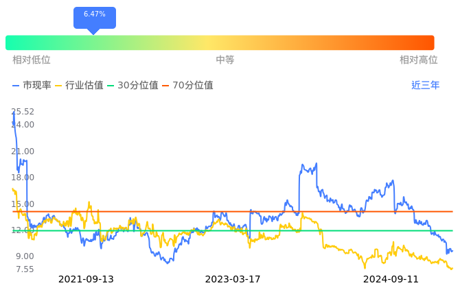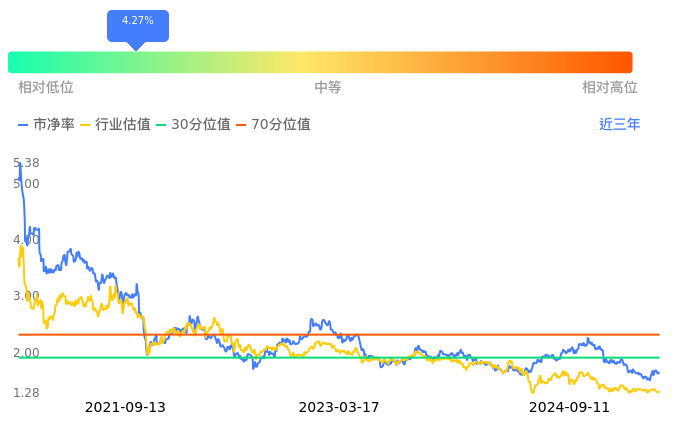 龙佰集团当前市净率PB为1.64,在所属的化学原料中,市净率PB排40,前五名分别为ST中泰市净率0.39、诚志股份市净率0.43、金能科技市净率0.45、华谊集团市净率0.54、滨化股份市净率0.58。龙佰集团当前市净率PB为1.64,超过近3年4.27%的历史数据。
