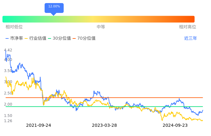 龙佰集团当前市净率PB为1.75,在所属的化学原料中,市净率PB排42,前五名分别为ST中泰市净率0.39、诚志股份市净率0.44、金能科技市净率0.46、华谊集团市净率0.55、滨化股份市净率0.58。龙佰集团当前市净率PB为1.75,超过近3年12.00%的历史数据。