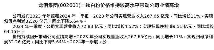 值得注意的是:2024年05月太平洋的王亮/王海涛分析师,首次发布关于龙佰集团的研究报告,标题为:龙佰集团(002601):钛白粉价格维持较高水平带动公司业绩高增。