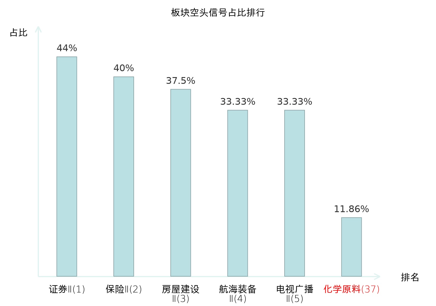 全市场所有行业板块中主力空头信号占比排名中,证券Ⅱ板块位居第一。证券Ⅱ板块名次提升最快,较昨日上升125位。