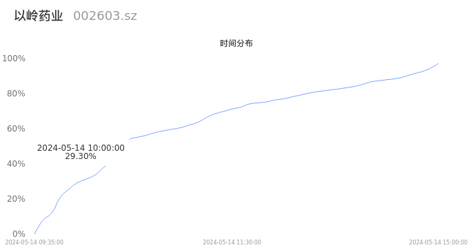 首先我们来看当日成交的时间分布。将今日交易时间按照5分钟的时间间隔进行切片,并绘制分布直方图进行观察。可以发现,10点之前的成交量占全天成交量的29.30%,这说明,该股票活跃时段换手率一般,资金热度较一般。