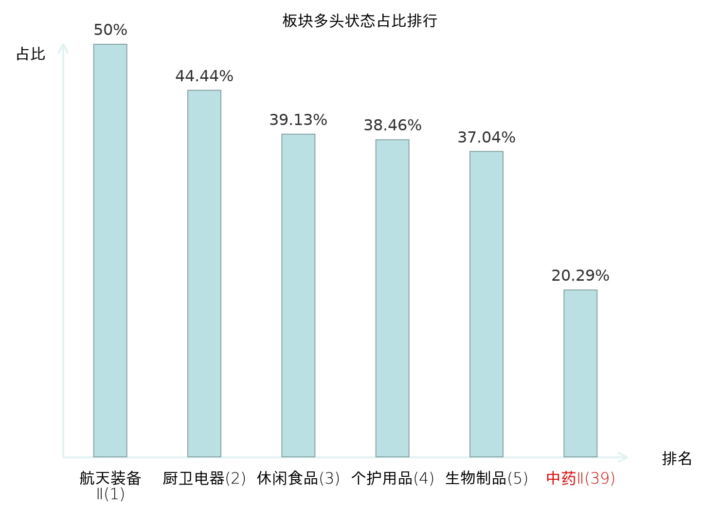 全市场所有行业板块中主力多头状态占比排名中,航天装备Ⅱ板块位居第一。小金属板块名次提升最快,较昨日上升53位。