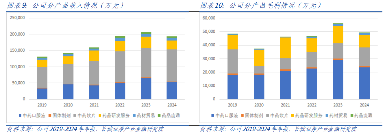 2019-2024年,公司表现较稳健,5年CAGR为8.2%,药品制造业务在营收中占比保持在近8成,对公司总营收影响较大,分产品看主要是中药饮片和中药口服液。