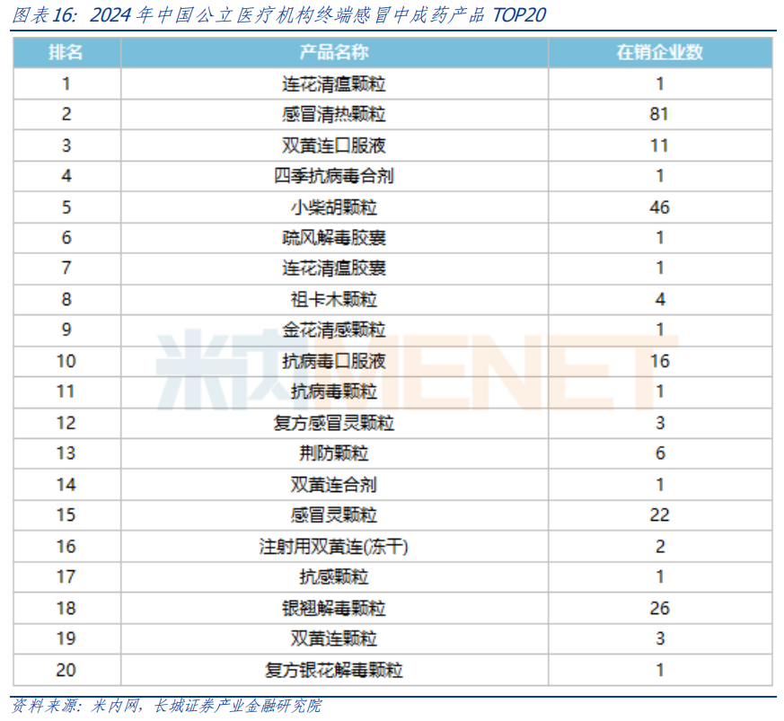 据米内网,感冒中成药近年来在我国三大终端六大市场中规模在200亿左右,2023年超过210亿元。2024年,公立医疗机构终端销售额约为85亿元,其中以岭药业以近25%份额居第一,太龙药业位列行业第3(同比上升2位);产品上,连花清瘟颗粒稳居榜首(2023年销售额超18亿元),双黄连口服液位列第3(2023年销售规模超7亿元);从品牌格局看,太龙药业是院端双黄连口服液第一品牌。