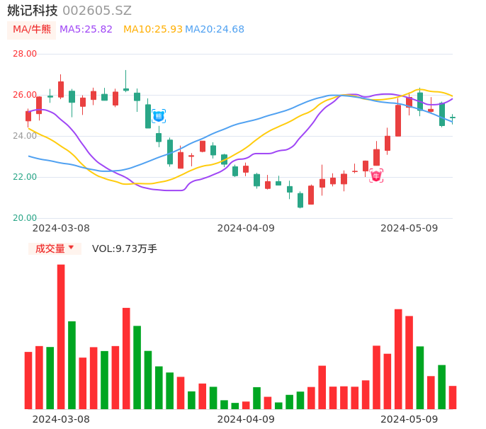 05月09日,姚记科技收报24.88,股价涨幅1.55%,成交金额2.41亿元,换手率2.95%。