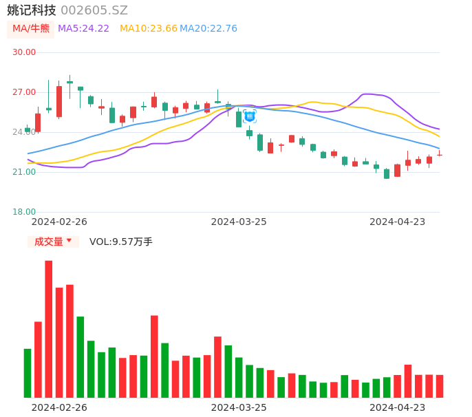 04月23日,姚记科技收报22.28,股价涨幅0.63%,成交金额2.14亿元,换手率2.90%。