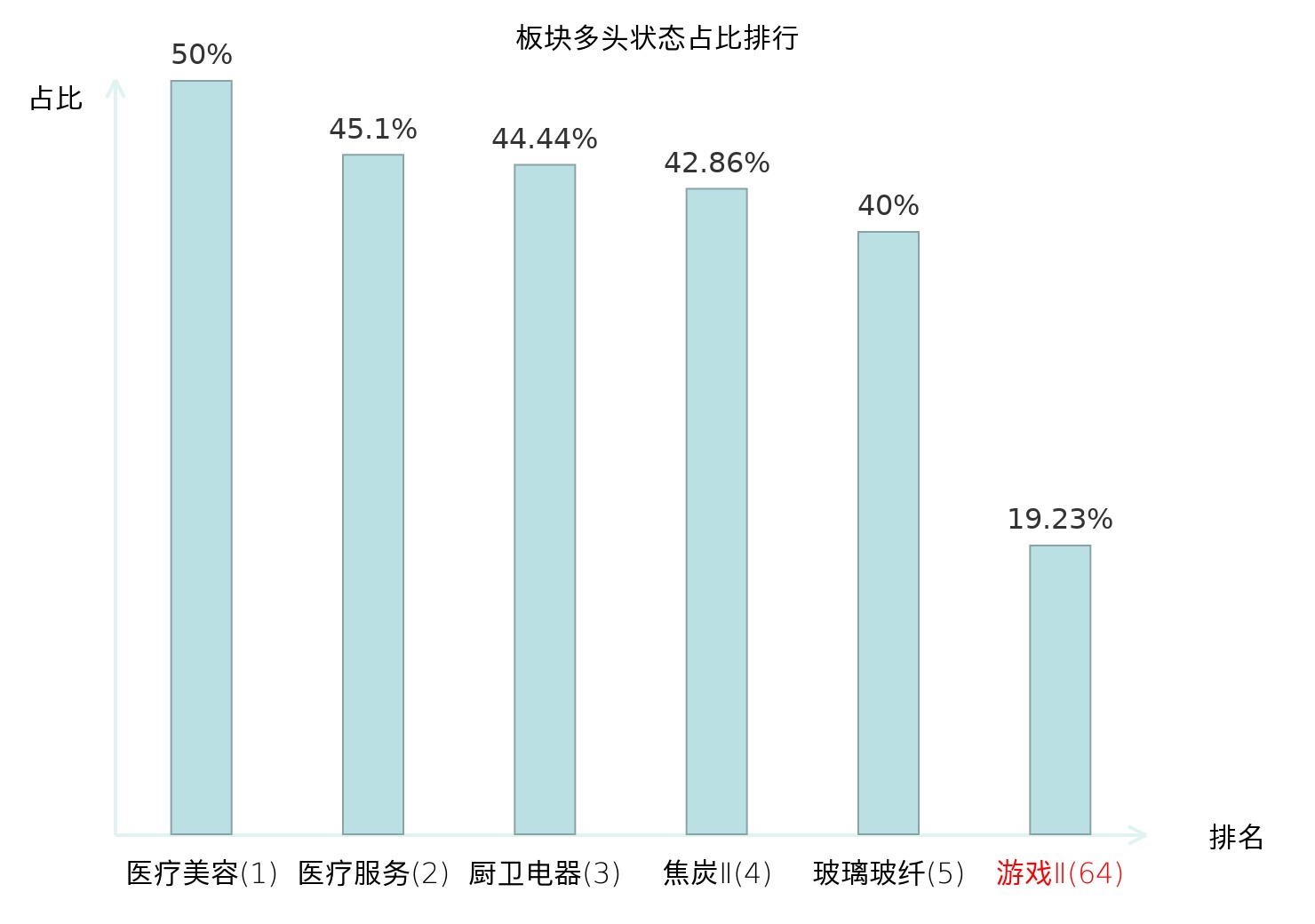 全市场所有行业板块中主力多头状态占比排名中,医疗美容板块位居第一。养殖业板块名次提升最快,较昨日上升90位。