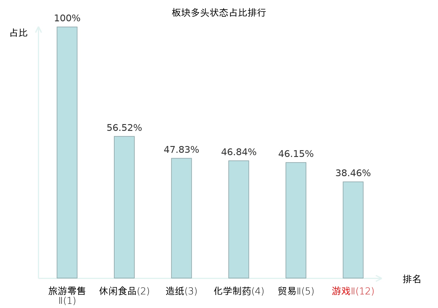 全市场所有行业板块中主力多头状态占比排名中,旅游零售Ⅱ板块位居第一。动物保健Ⅱ板块名次提升最快,较昨日上升58位。