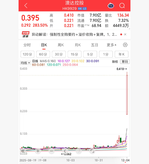 上证报中国证券网讯12月4日,澳达控股开盘暴涨,最高涨至0.41港元/股,涨幅接近300%,截至10时19分,澳达控股报0.395港元/股,涨283.50%。