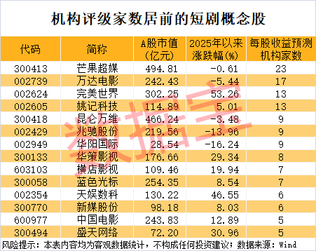 机构关注度方面,共有14只短剧概念股获得5家以上机构“积极型”(含买入、增持、强烈推荐等)评级。机构评级家数最多的是芒果超媒,达到23家。其次是万达电影、完美世界、姚记科技等。
