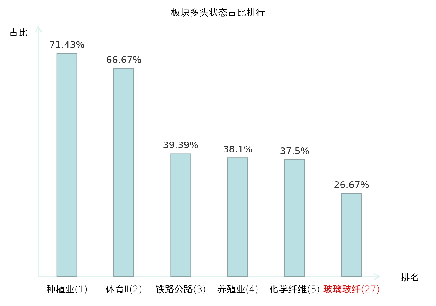 全市场所有行业板块中主力多头状态占比排名中,种植业板块位居第一。养殖业板块名次提升最快,较昨日上升99位。