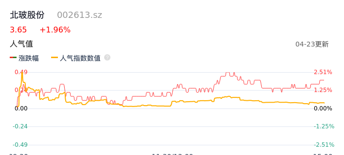 04月23日,北玻股份收报3.65,股价涨幅1.96%,成交金额2925.17万元,换手率1.34%。