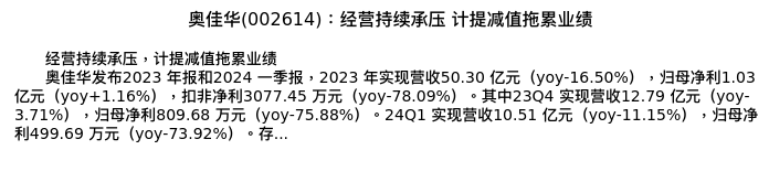 值得注意的是:2024年04月华泰证券的林寰宇/周衍峰/王森泉/李裕恬分析师,首次发布关于奥佳华的研究报告,标题为:奥佳华(002614):经营持续承压 计提减值拖累业绩。