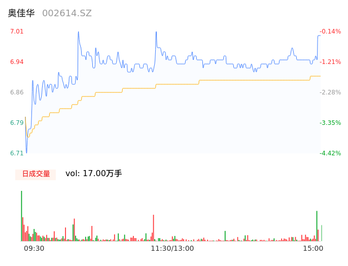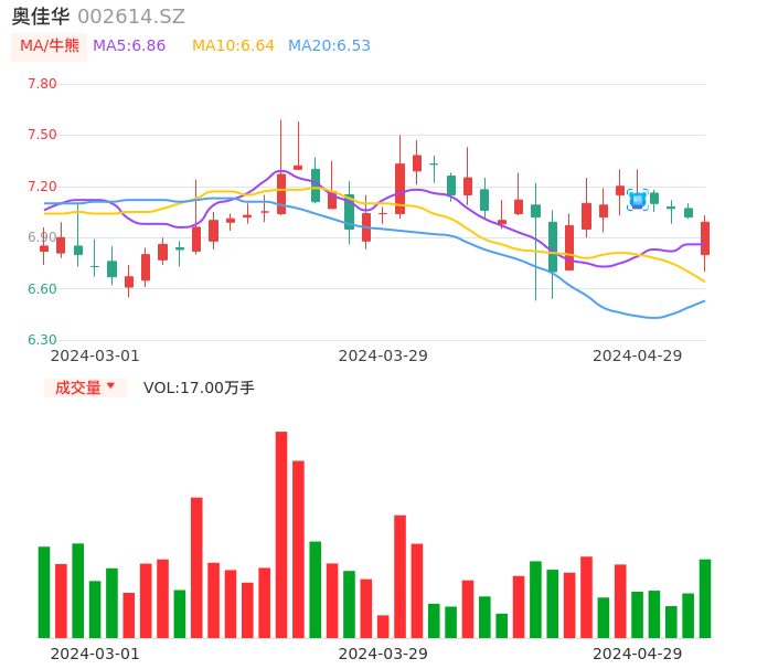 04月29日,奥佳华收报6.99,股价涨幅-0.43%,成交金额1.17亿元,换手率3.85%。
