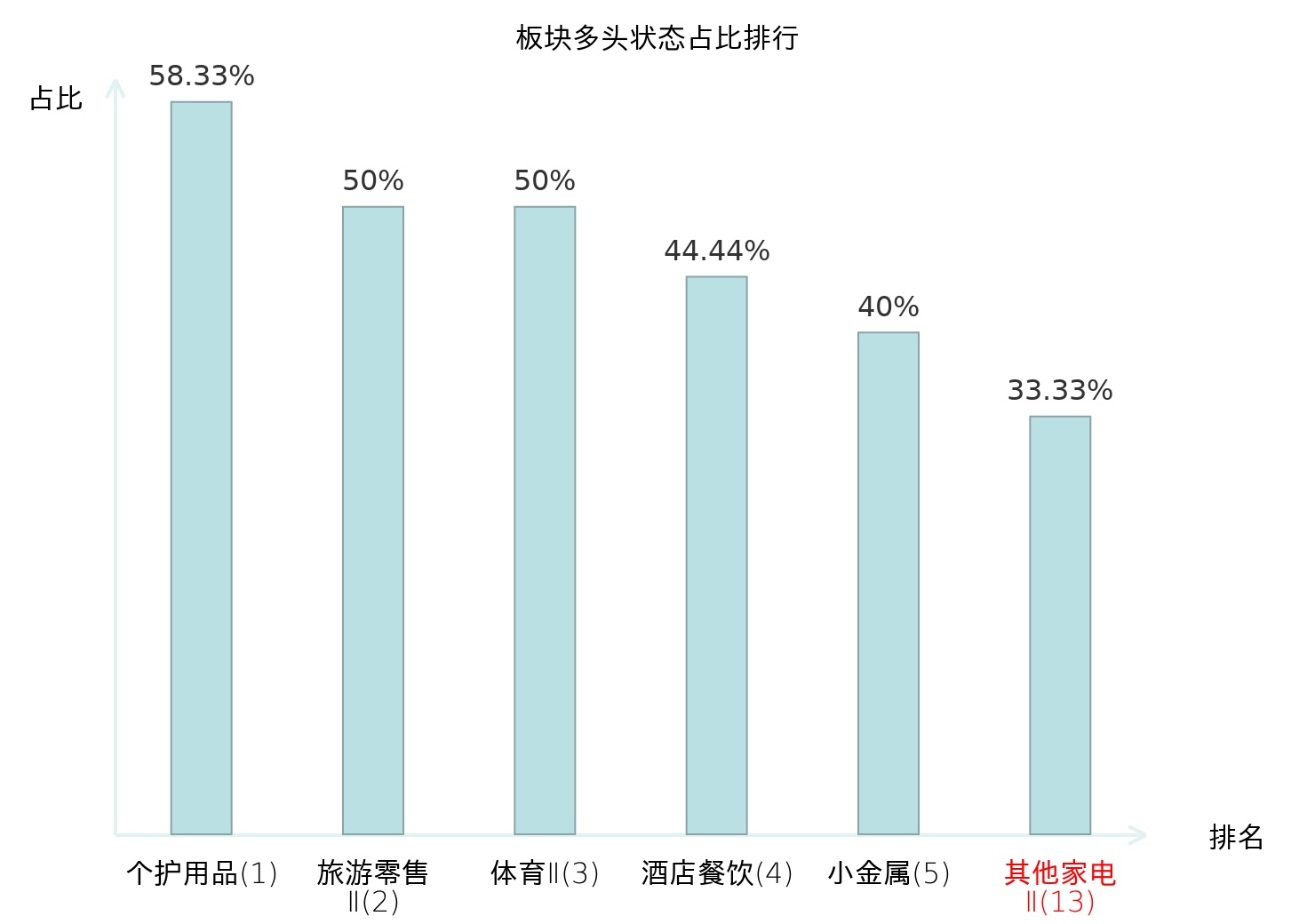 全市场所有行业板块中主力多头状态占比排名中,个护用品板块位居第一。乘用车板块名次提升最快,较昨日上升87位。