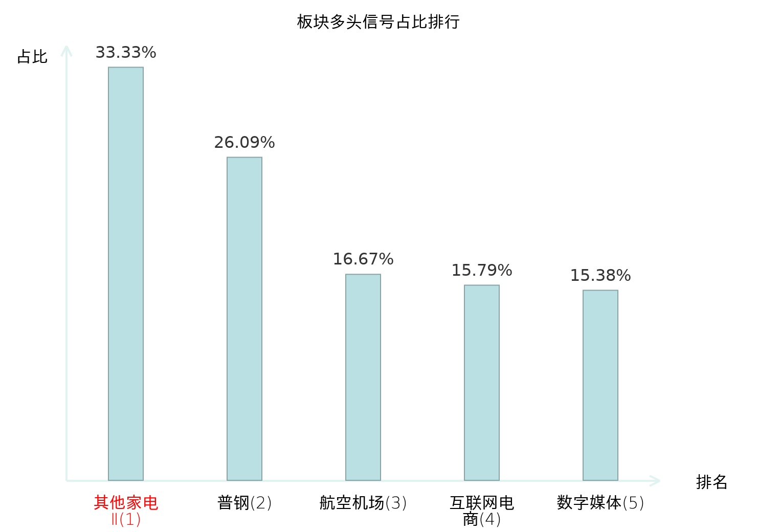 全市场所有行业板块中主力多头信号占比排名中,其他家电Ⅱ板块位居第一。其他家电Ⅱ板块名次提升最快,较昨日上升129位。