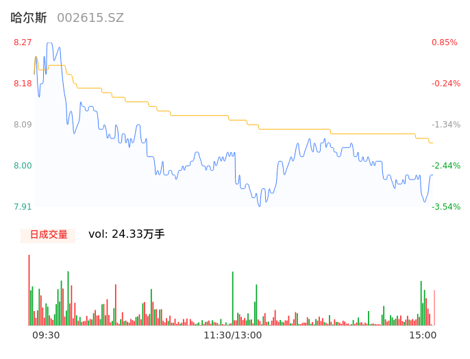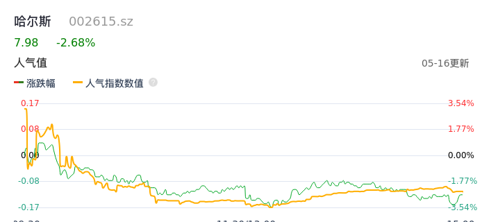 05月16日,哈尔斯收报7.98,股价涨幅-2.68%,成交金额1.96亿元,换手率8.00%。
