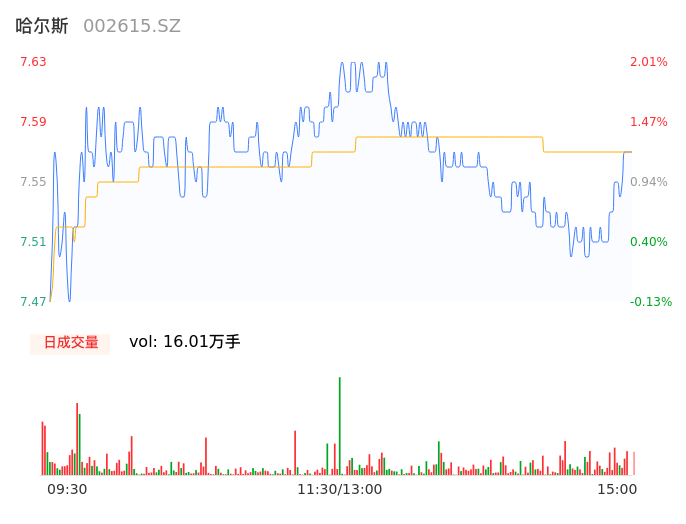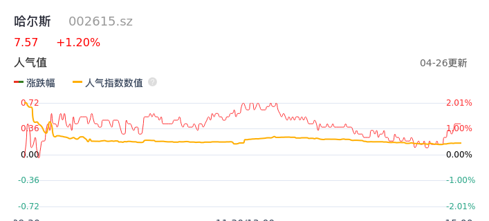 04月26日,哈尔斯收报7.57,股价涨幅1.20%,成交金额1.21亿元,换手率5.56%。