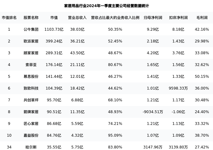 哈尔斯最新报告期数据为一季度,下表汇总了家居用品行业内市值靠前的公司一季度主要经营数据