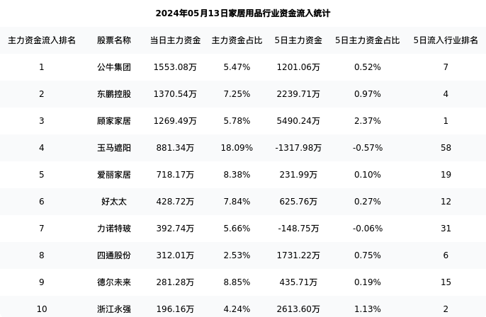 从主力资金流向来看,家居用品行业今日主力资金流入7.35亿元,在所有申万二级行业中排名:46/131。